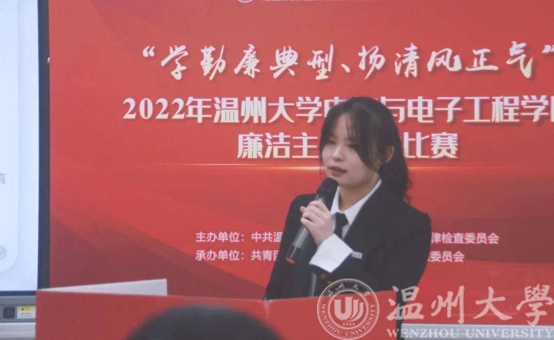 为深入学习贯彻党的二十大精神,持续推动党史学习教育走深走实,引导广大学生学习老一辈革命家、优秀共产党员艰苦奋斗、清正廉洁的品格,助推“清廉温大”建设,MG冰球官网于2022年11月23日晚在南校1A-203举行第三届“学勤廉典型,扬清正风气”主题演讲比赛。本次比赛由学院党委副书记曾蓓蕾、学院学工办辅导员潘龙飞、余明新、陈海彤、屠昌浩老师担任评委。程佳聪同学主持,各班代表现场参与此次活动,2022级全体新生线上观看了比赛。