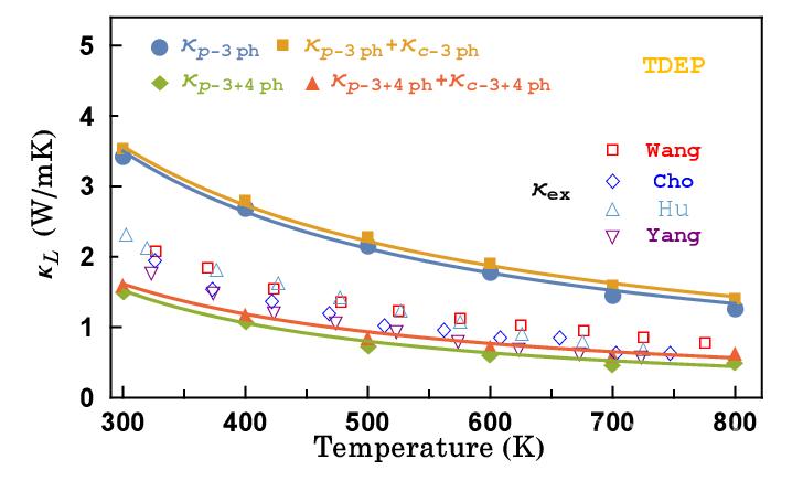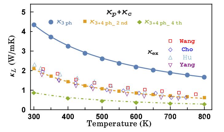 图2. 考虑三声子和四声子散射对Cu2GeSe3声子输运的影响
