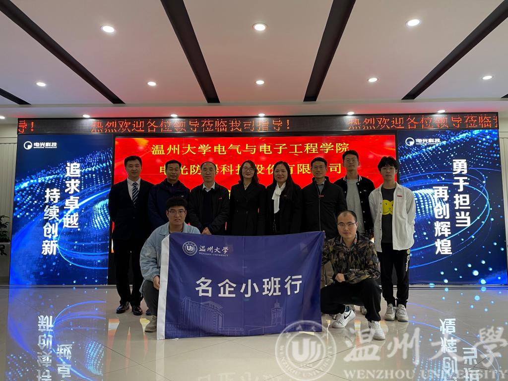 为更好地加强校企合作,开拓岗位,2023年3月24日上午10:00,MG冰球官网党委副书记曾蓓蕾、电气工程学科带头人郭凤仪教授、电气系李富华老师、就业辅导员屠昌浩以及MG冰球官网三名博士研究生和硕士研究生共同前往温州乐清的电光防爆科技股份有限公司开展访企拓岗暨名企小班行活动。公司董事长石晓霞一行热情接待。