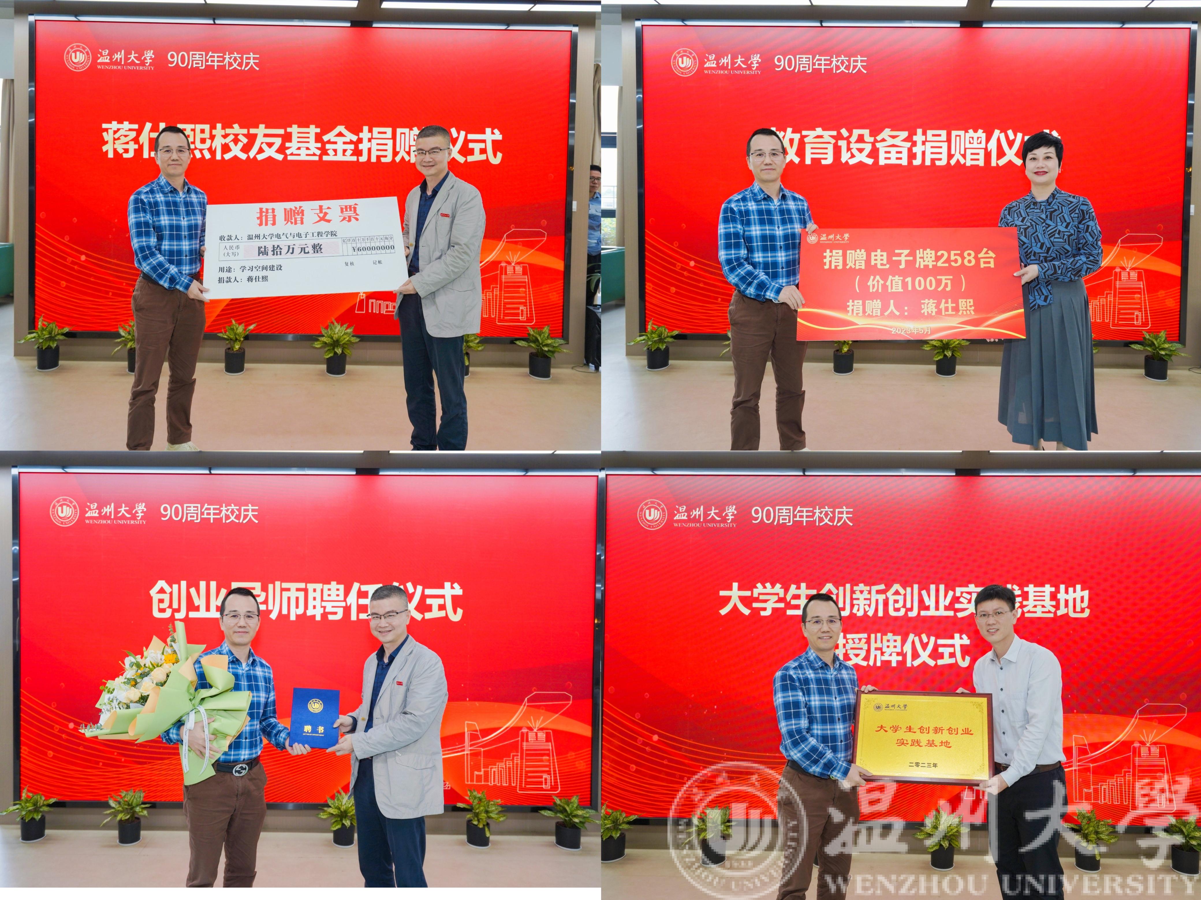 在现场各位嘉宾的共同见证下,蒋仕熙校友与李方强书记和张若妤处长进行了隆重的基金捐赠与教育设备捐赠仪式。与此同时,MG冰球官网还聘请蒋仕熙校友担任我校创业导师,并授予蒋仕熙校友的企业为我校大学生创新创业实践基地。