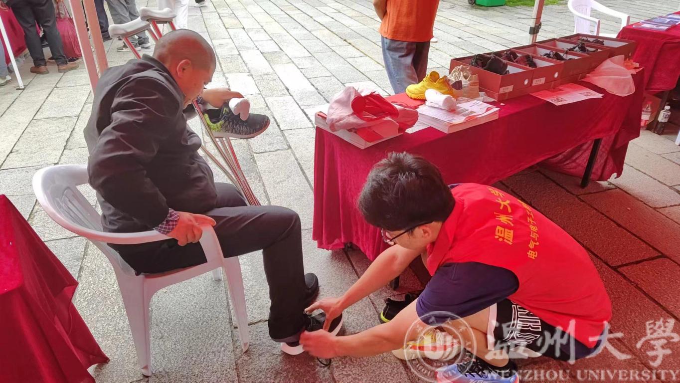 周末的早晨,志愿者们早早准备从学校出发来到集市,摆放好了宣传单和鞋子。活动启动后,群众们从四面八法涌来。志愿者们耐心地给群众们介绍单脚鞋银行这个项目,并告诉他们这是一个为单鞋人士提供帮助,让他们生活更加便捷的组织。在场的群众纷纷为我们的行为点赞,并表示很乐意为我们宣传,让公益愈行愈远。在活动期间,在群众的宣传下,我们帮助到了在集市中参观的单脚人士——一位四十多岁的单脚叔叔,队员们积极为他试穿鞋,最终选定了两只合脚的鞋子免费带走。