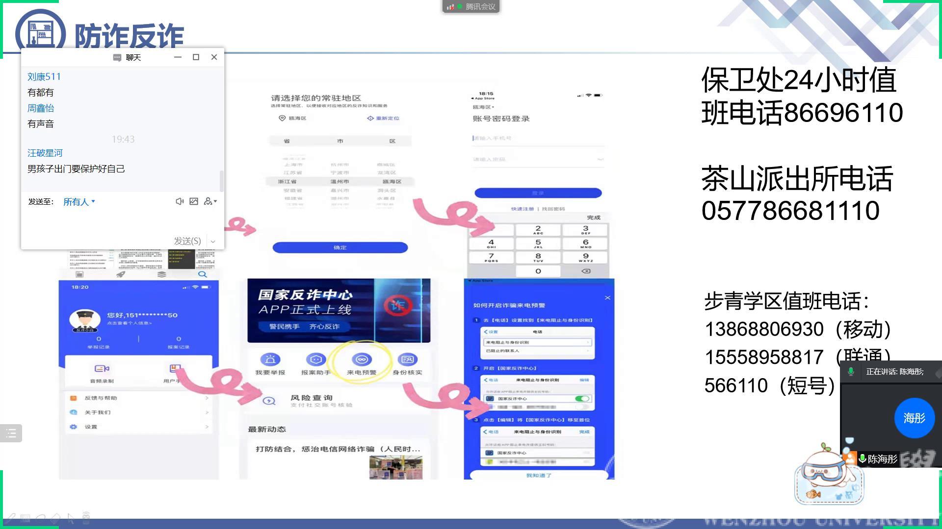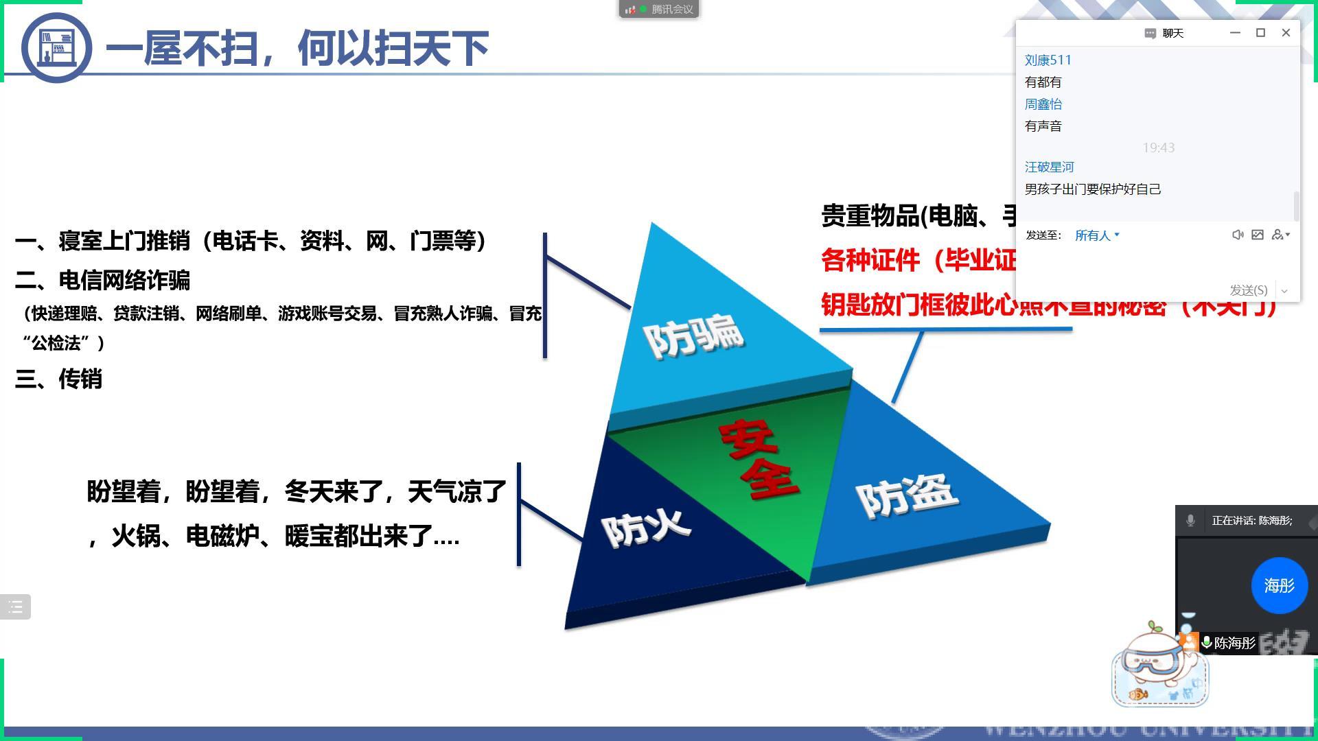 2月21日晚上19:30,MG冰球官网召开全体寝室长线上会议。会上公寓辅导员陈海彤老师从寝室卫生管理、公寓安全管理、防诈反诈、寝室关系、宗教政策以及心理健康方面进行讲解,重点讲解了学校的公寓管理规定。另外陈老师就宿舍人际关系进行讲解,希望同学们能够珍惜在寝室的情谊;同时寝室长要积极参与心理健康相关的培训,关注寝室同学的心理状态以及日常考勤,有情况及时和辅导员反馈。