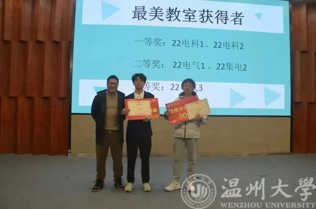学工办主任廖晓安老师、辅导员陈海彤老师为“最美班级”获奖班级颁奖;辅导员屠昌浩老师、余明新老师为获奖寝室颁奖。