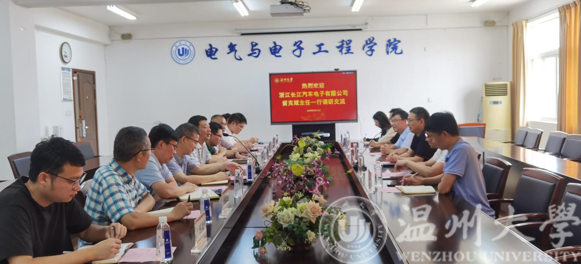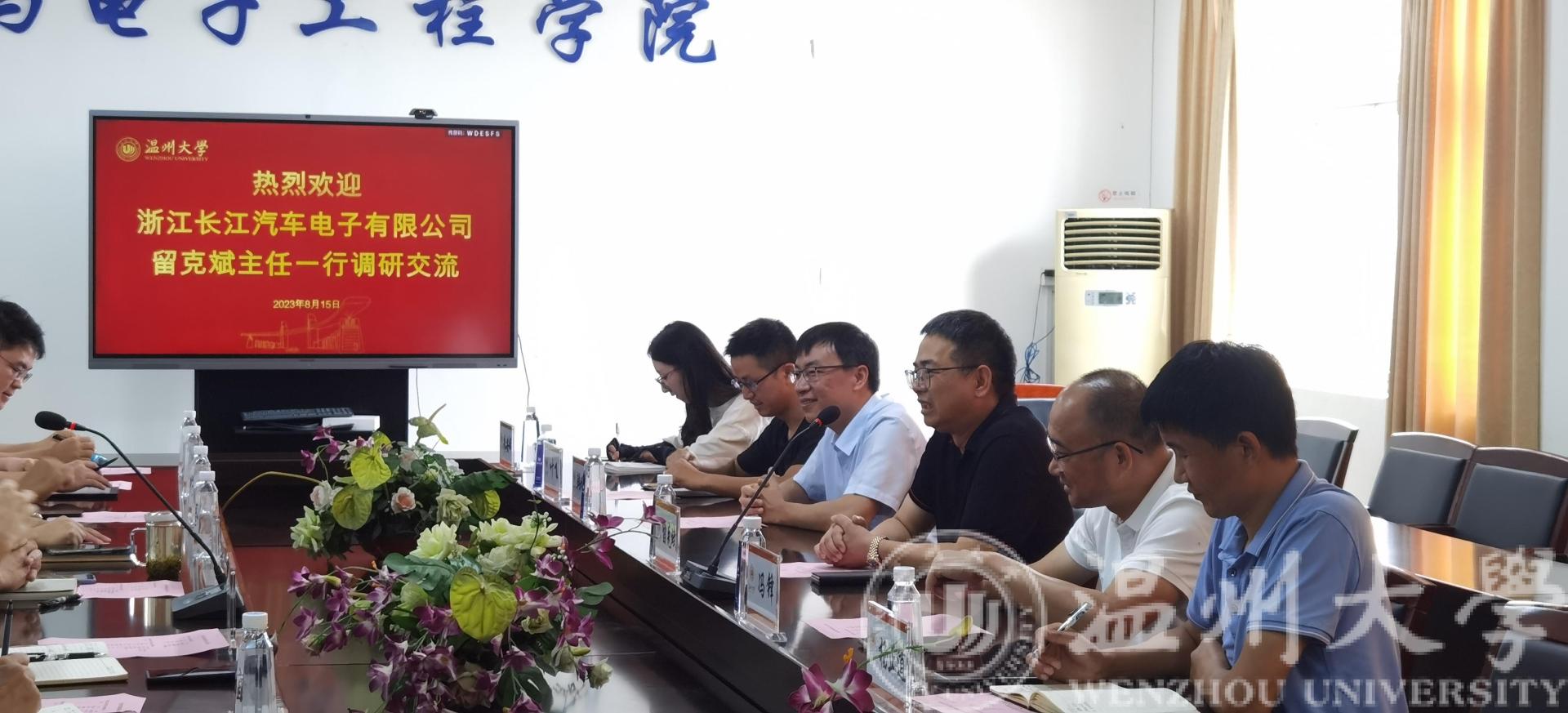 会上,汪鹏君院长首先对留客斌主任一行的到来表示诚挚的欢迎,就学院的师资队伍、科研情况、人才培养、服务地方等方面介绍了学院发展情况。浙江长江汽车电子有限公司留客斌主任介绍了企业的经营内容以及企业急需攻克的技术难点。