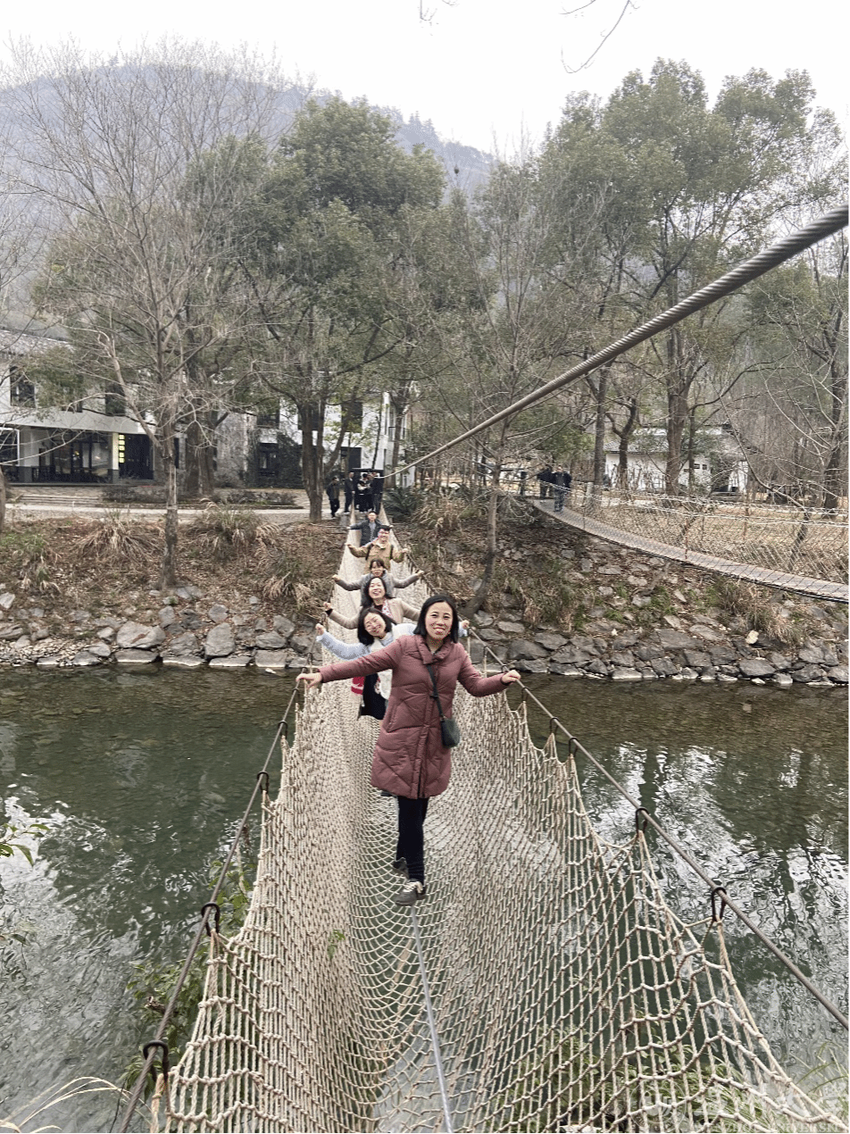 老师们三三两两漫步在书院中,欣赏身边的美景,谈论美食与趣事。有人去溪边观赏五颜六色的鱼儿,欢欢笑笑饶有兴致;有人精力充沛爬上高山,对山上不同的树木花草轻易识别;有人感叹书院近几年的发展变化,唤起部分老师的儿时记忆;还有的年轻老师挑战吊桥,尽显年轻人的大胆与活力。
