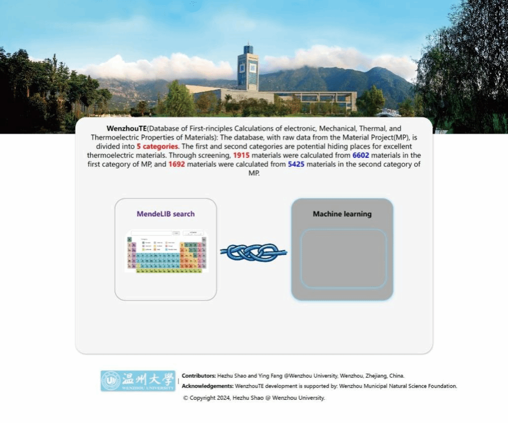 该工作得到温州市基础性工业科研项目(项目名称:基于材料基因组方法的高性能热电材料开发,项目号G20210016,项目经费:10万元人民币,其中财政支持5万元人民币,自筹5万元人民币,项目起止时间2022.1至2024年.12)的支持,另外MG冰球突破官网网站也为课题组在计算服务器(目前建有10个计算节点)搭建上提供了大力支持,因而该材料数据库命名为“温州热电”(Wenzhou TE)。