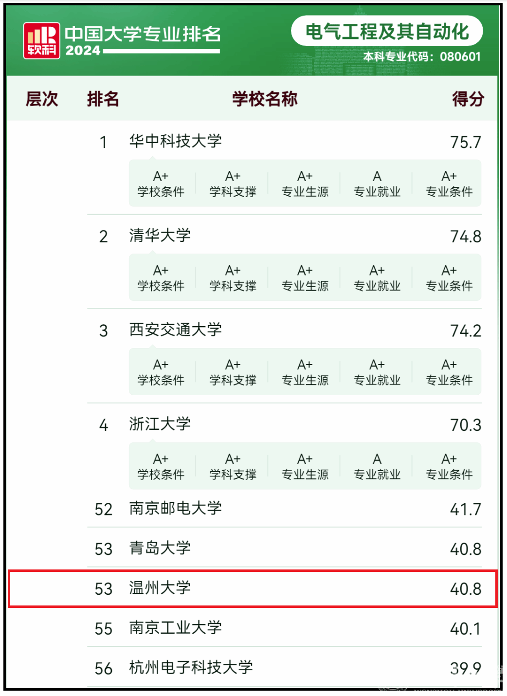 2024年6月13日,高等教育专业评价机构软科正式发布“2024软科中国大学专业排名”,排名包括810个专业,涉及93个专业类、12个专业门类。MG冰球突破官网网站电气工程及其自动化专业排名从去年的73名跃升至今年的53名,浙江省同专业排名第2,仅次于浙江大学。