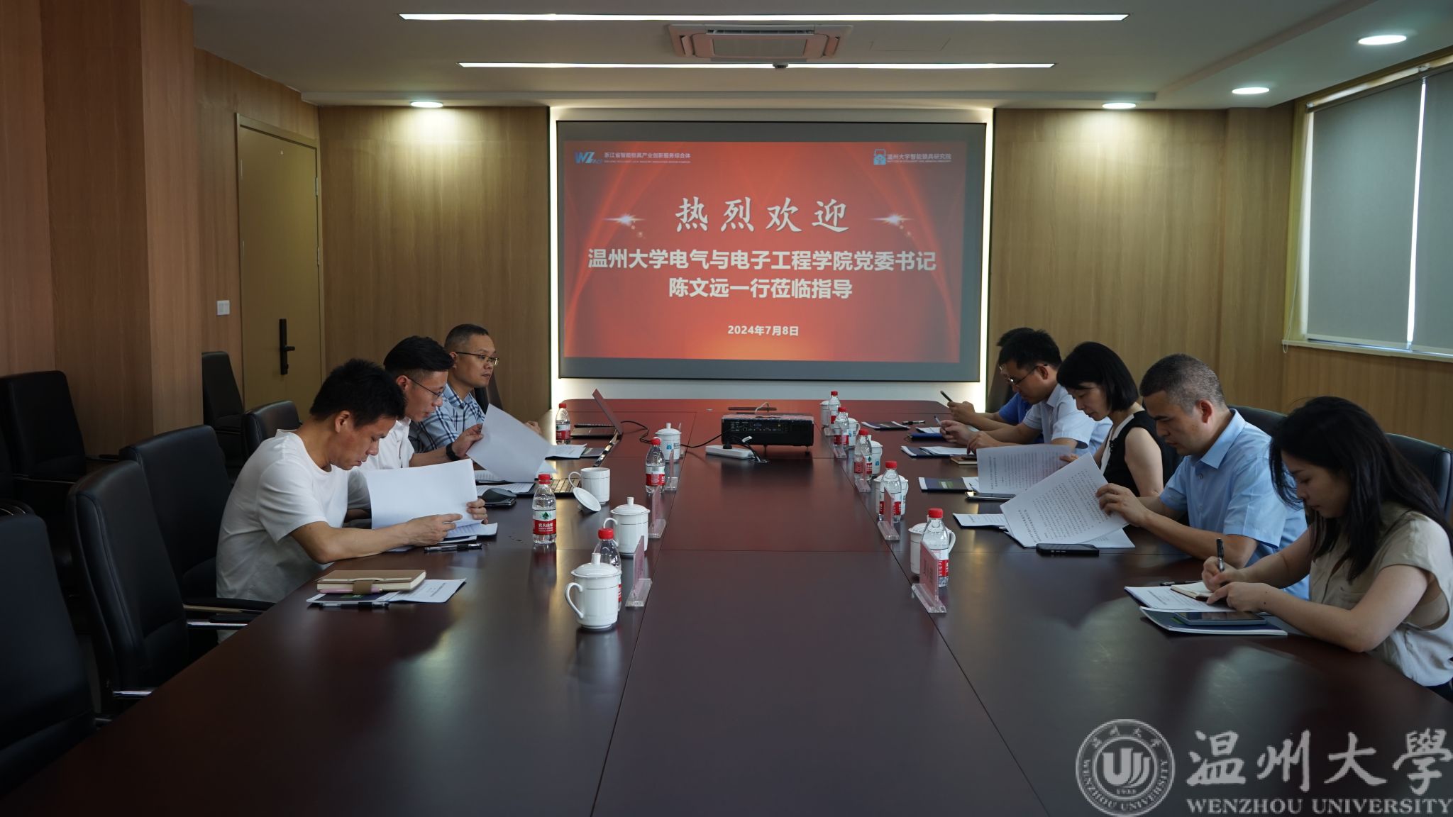 与会人员交流座谈。研究院院长阮秀凯介绍了温大锁院与地方政府共建的背景,以及近年来的运行情况及在人才、创新、产品研发与转发、智能制造、产业生态打造、区域品牌培育等方面取得的工作成效,并就建设发展过程中遇到的困难和瓶颈问题进行了交流讨论。