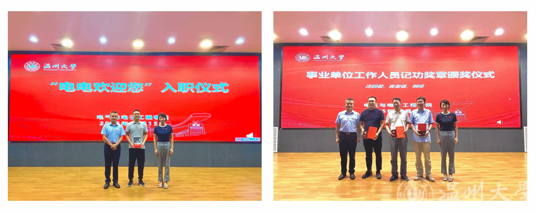 会议期间,还举行了“电电欢迎您”新教师入职仪式与温州市事业单位工作人员记功奖励颁奖仪式。