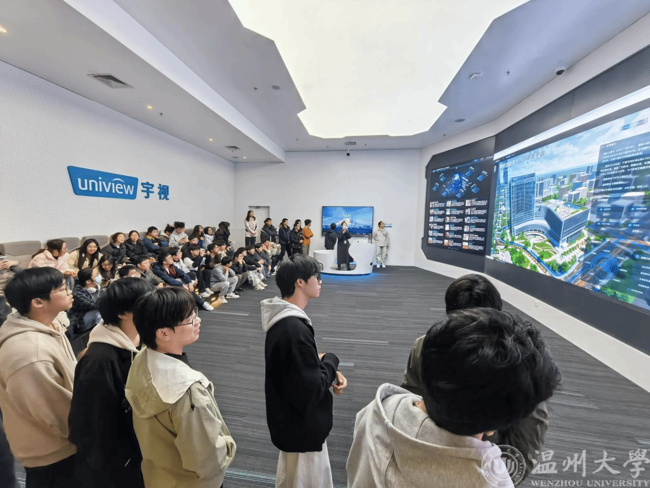下午12:30同学们乘车前往第三站宇视科技,宇视科技副总裁张晓琳和人力资源部俞晓珏、李磊热情接待。在参观中,同学们走进智能安防产品实验室与数字化展厅,近距离接触了AI视觉技术在智慧城市、工业互联等领域的应用案例,前沿科技的魅力让大家频频发出赞叹。