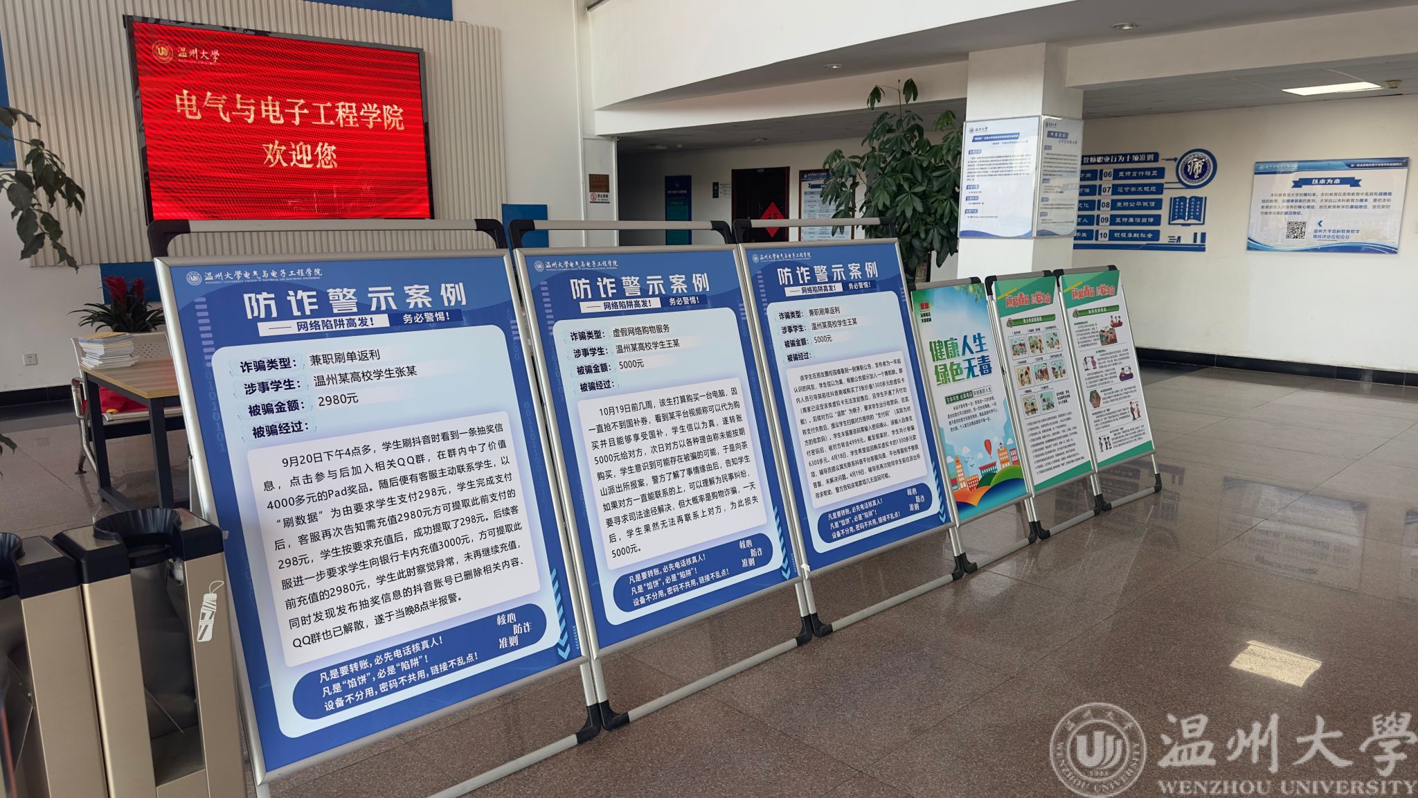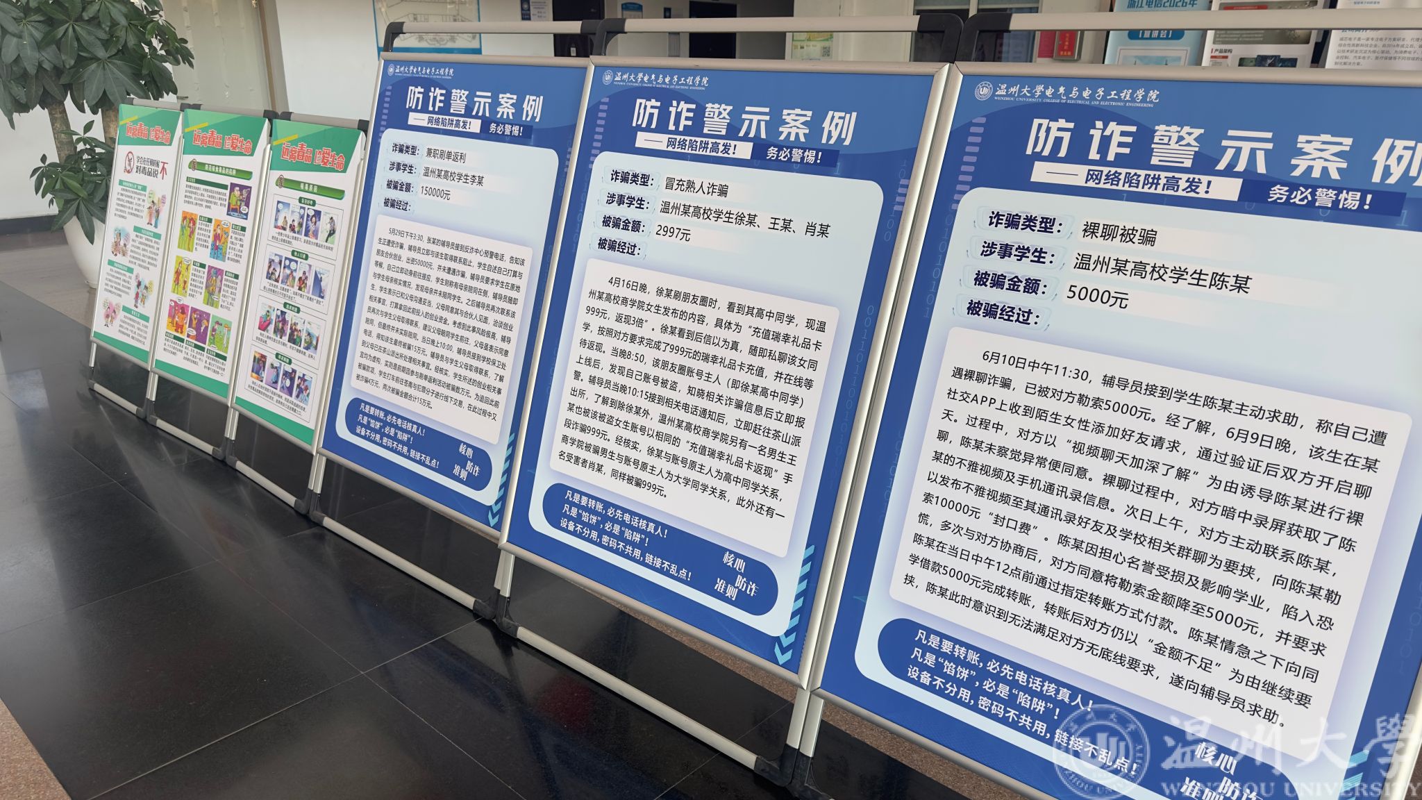 里,6个温州高校真实案例格外醒目:从 “刷单返利骗走 2980 元”,到 “裸聊勒索损失 5000 元”,每个案例都标注了涉事学生身份、被骗细节,还附上 “转账先核真人”“陌生链接不乱点” 等防骗准则;