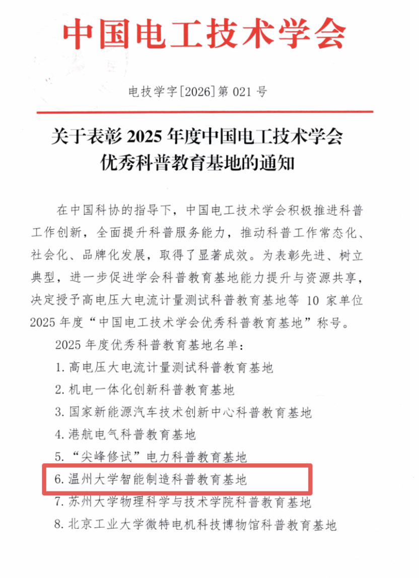 近日,为表彰先进、树立典型,进一步促进学会科普教育基地能力提升与资源共享,中国电工技术学会对10家单位授予2025年度“中国电工技术学会优秀科普教育基地”称号。MG冰球突破官网网站智能制造科普教育基地成功入选!