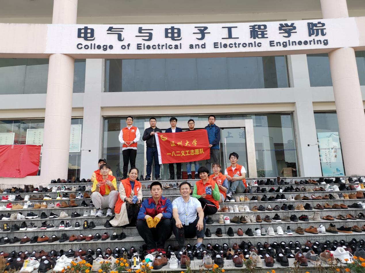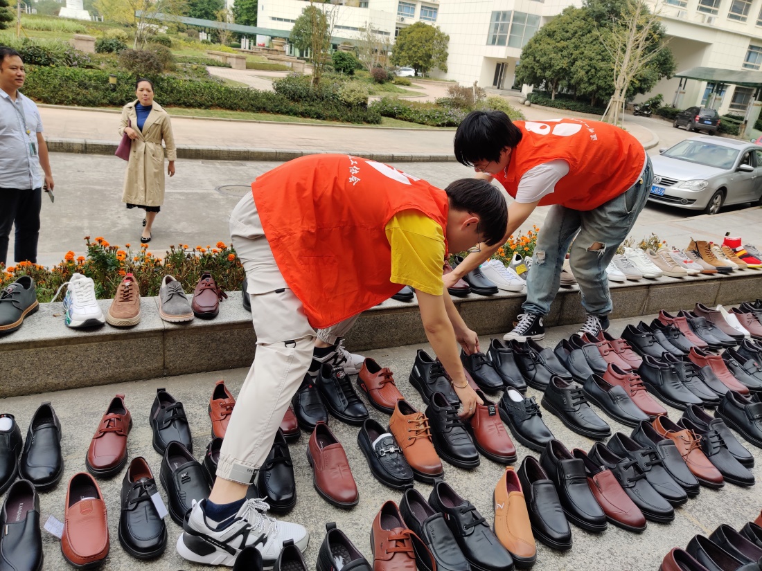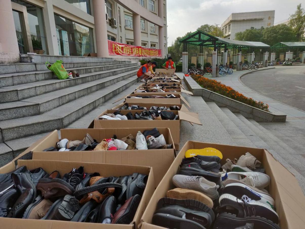 鞋子整理打包完毕运到MG冰球突破官网网站时已经是十一点半。志愿者们依然兴奋不已,顾不上吃饭,立马开始工作,电气学院八级大台阶顿时成了天然的大鞋架。