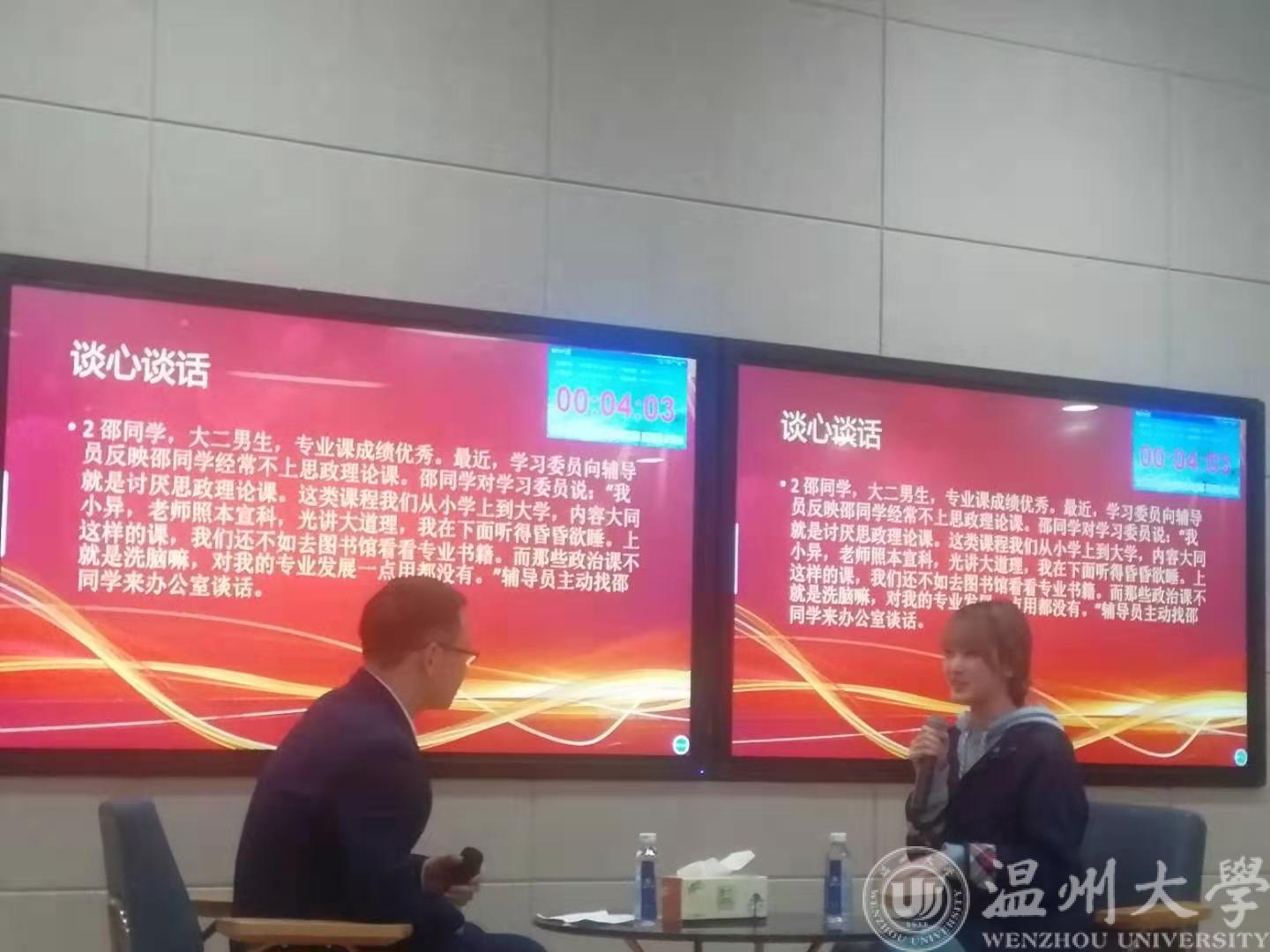 本次比赛由温州市教育局主办,MG冰球突破官网网站承办,来自温州的12所高校、20名选手参加了此次比赛。本次辅导员素质能力大赛包括基础知识测试、案例分析、谈心谈话和理论宣讲四个环节。其中,基础知识测试主要是基本知识考察和网文写作,全面考察辅导员对时政热点、党员应知应会、学生管理规定、辅导员职业规定等知识的考查;案例分析主要通过学生工作实际案例展现辅导员对日常事务管理、突发事件、网络舆论等的综合处理能力;谈心谈话主要考察辅导员对于学生的一对一沟通交流,主要包括心理问题、情绪情感、就业升学、职业规划等的沟通和协调能力;理论宣讲环节主要考察辅导员对于习近平新时代中国特色社会主义思想和中国梦宣传教育、社会主义核心价值观教育的理论宣传阐释能力。整体环节较注重辅导员思政工作中的专业素养,是对辅导员综合素质的全面考察。