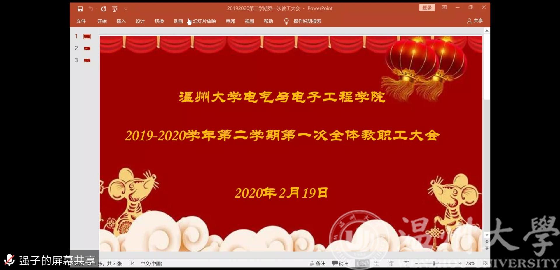 为认真贯彻落实国家、省、市、区关于新型冠状病毒感染的肺炎疫情防控工作的要求,及省教育厅疫情防控背景下“停课不停教、停课不停学”、我校“开学不返校”的文件精神,积极部署学院网上教学组织与管理有关工作,确保正式返校后学院各项工作立即进入正轨、无缝衔接、高效运行。2月19日下午,电气与电子工程学院召开新学期全体教工视频会议,会议由学院党总支书记李方强主持。
