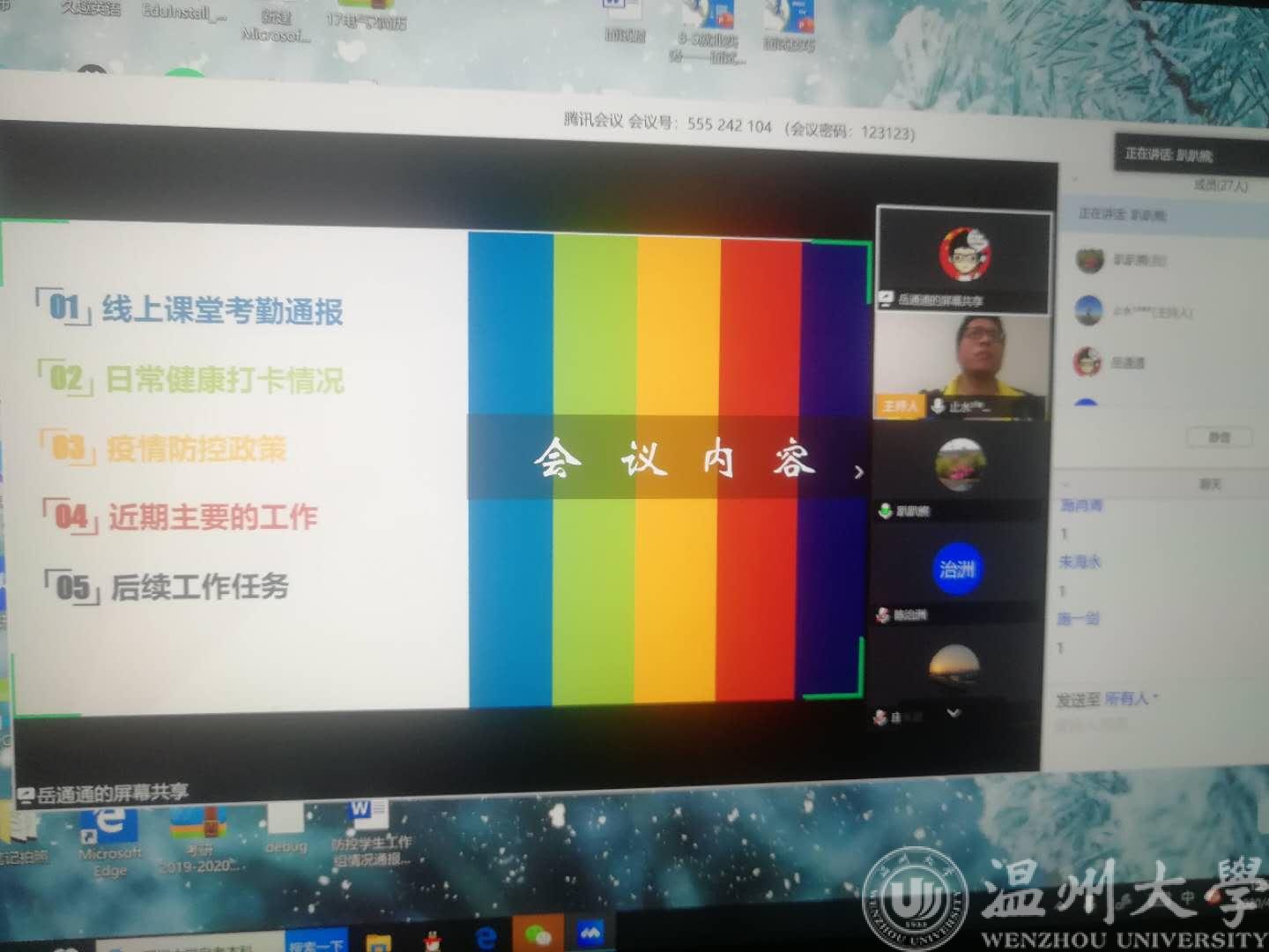 为进一步做好新冠肺炎疫情防控工作,维护开学前后学生身体健康及学校安全,4月17日晚19:00,MG冰球突破官网网站通过腾讯会议APP召开本学期“期中班主任工作网络主题会议”,此次会议由院党委副书记曾蓓蕾主持,学院全体辅导员、各年级班主任参加了此次会议。
