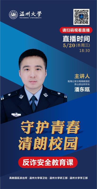 为做好反诈安全宣传教育,切实增强广大师生防范电信网络诈骗的意识,5月20日晚,学校举行了全校师生“同上一堂反诈安全教育课”的线上活动,本次线上活动以“守护青春 清朗校园”为主题,由瓯海公安分局高教园区派出所所长潘东瓯主讲,MG冰球官网学子积极参与线上学习。