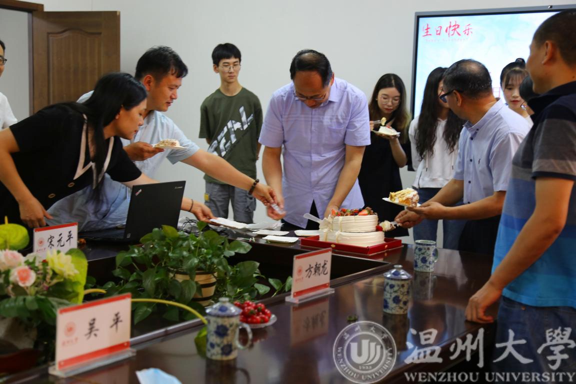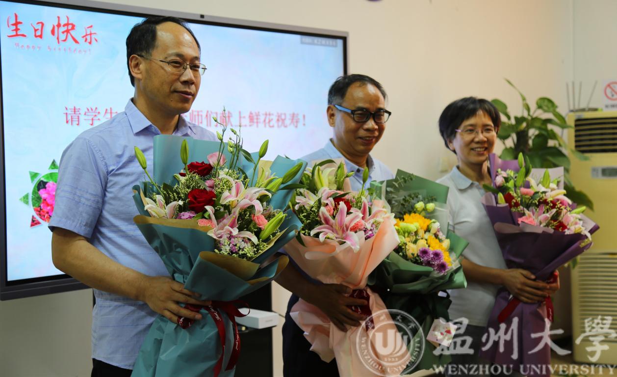 生日会由学院副书记曾蓓蕾主持,副院长朱翔鸥向寿星们祝寿。学生代表向生日教师献上鲜花并一起唱响《生日快乐》歌。借着鲜花和歌声,我们恭祝蒋小洛老师、施肖菁老师、吴平老师和叶鹏老师50岁生日快乐!恭祝张耀举老师60岁生日快乐!