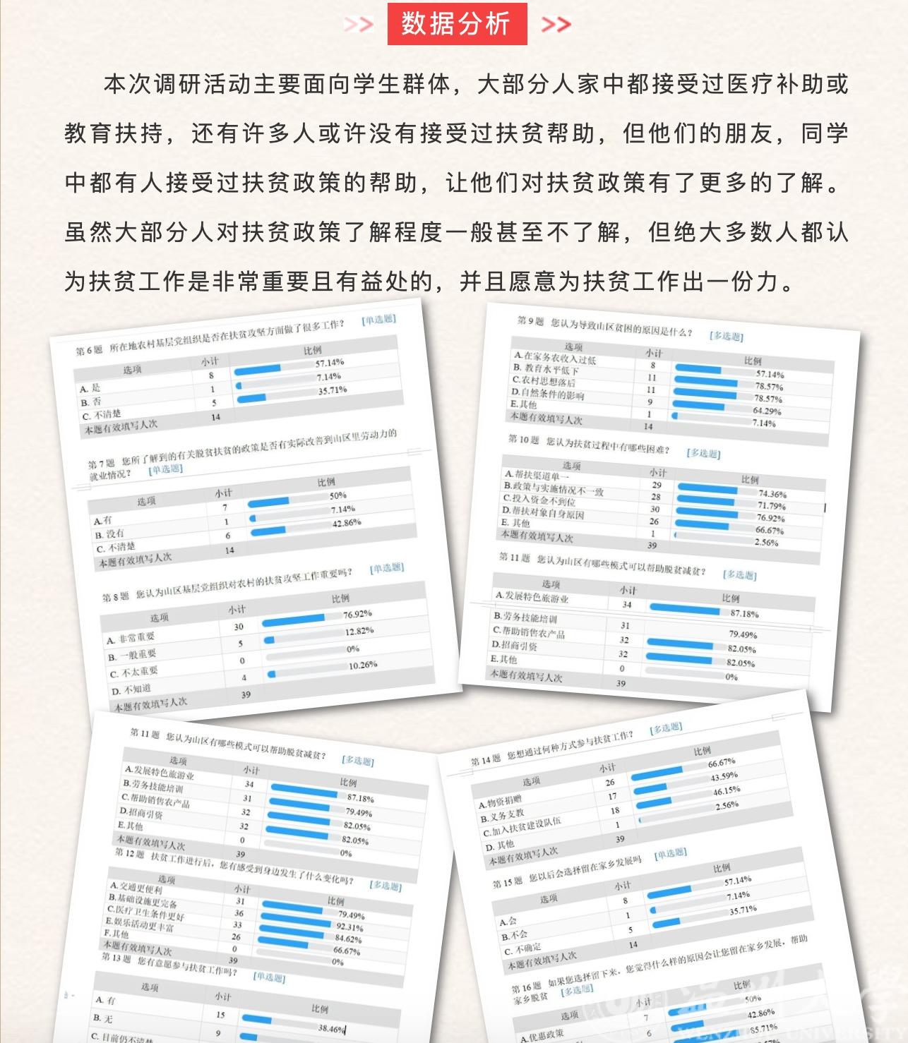 2020年8月8日,MG冰球突破官网网站第一届“益行”暑期社会实践队关于山区扶贫线上调研活动圆满完成。为引导人们关注贫困问题、关爱贫困人口、关心扶贫工作,营造“人人皆愿为”的社会扶贫氛围,弘扬“人人皆可为”的公众扶贫理念,体验“人人皆能为”的参与扶贫机制,也为了“益行”暑期实践队后续活动更好的展开,实践队线上全体成员开展了关于山区扶贫的线上调研活动,旨在通过线上调研活动,分析人们对于扶贫工作的了解程度,让更多的人关注扶贫工作,参与扶贫工作中来。