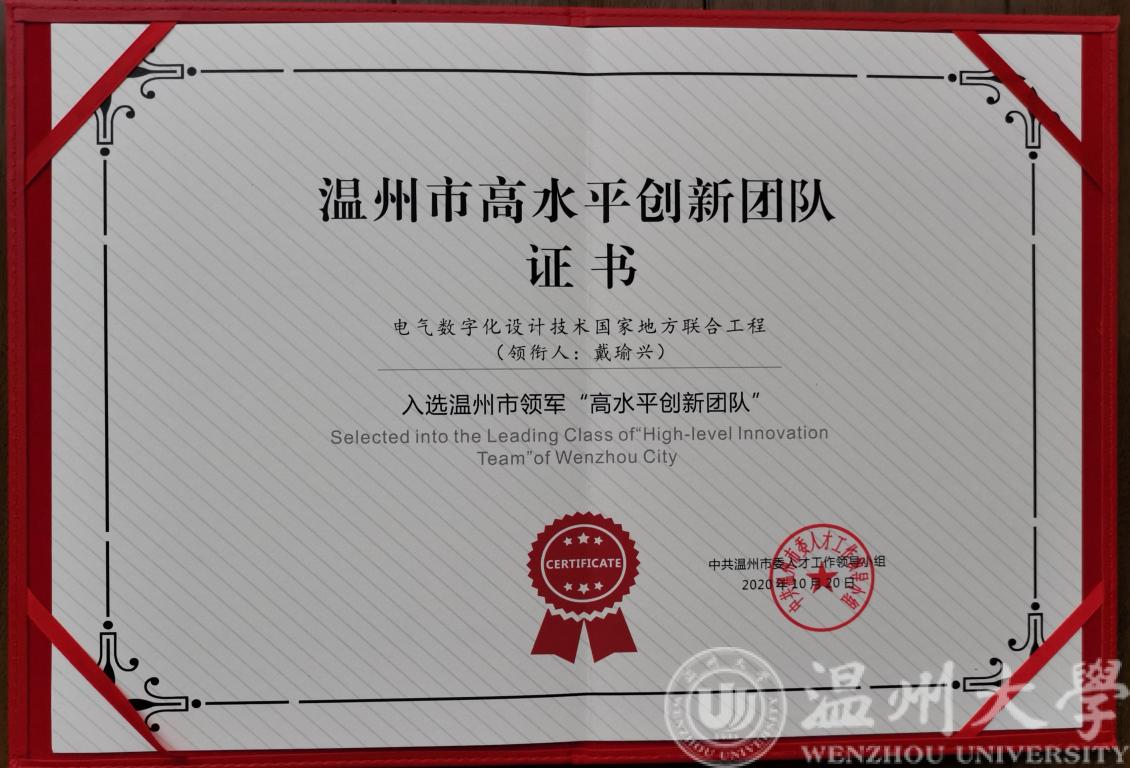 近日,温州市委人才办公布了2020年温州市重大人才工程入选名单,MG冰球官网戴瑜兴老师带头的电气数字化设计技术国家地方联合工程团队入选2020年温州市领军“高水平创新团队”,吴桂初老师入选温州市“高层次人才特殊支持计划”杰出人才。