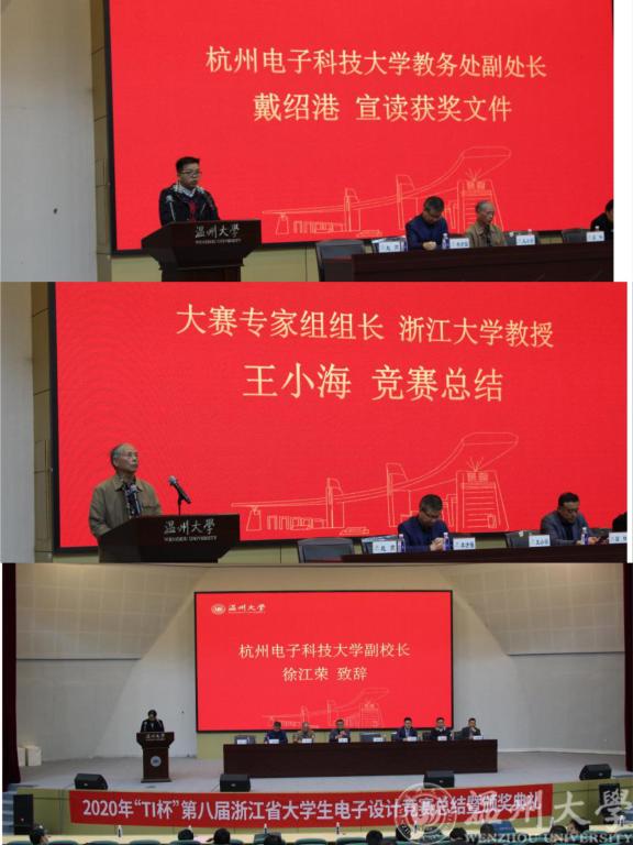 薛伟副校长代表学校致辞,向本次大赛的成功举办表示祝贺,向莅临本次颁奖典礼的各位领导、专家、老师和同学们表示热烈的欢迎。他表示,我们现今的教育正从“就业从业”向“创新创业”教育方向转变,需要更多具有实践创新能力的人才。MG冰球突破官网网站作为浙南闽北赣东地区唯一的综合性大学,始终坚持“质量立校”,着力培养“重实践、强创新、能创业、善管理、敢担当”的高素质应用型人才。 学校尤其重视鼓励学生积极参与学科竞赛,通过将理论与实践紧密结合,创意与创作相互融合,创新与创业紧密协同的方式,培养学生的实践创新能力。一年一度的大学生电子设计竞赛正好为我们提供和搭载了一个这样的平台。