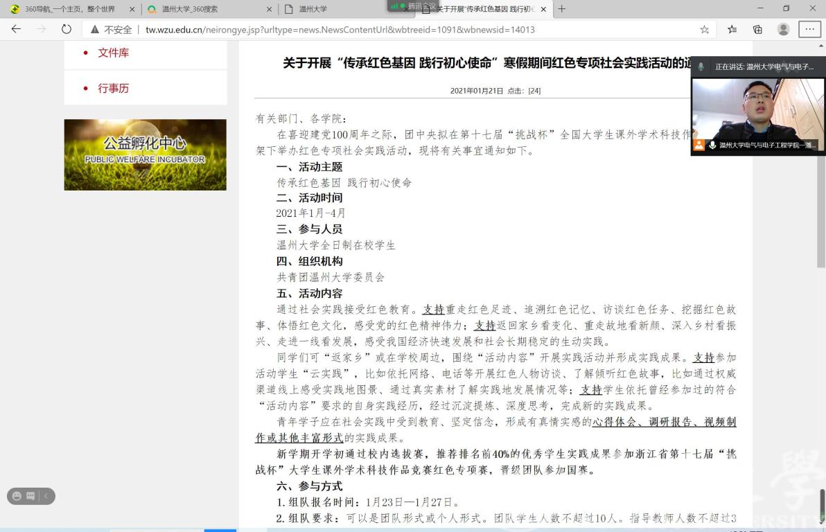 2021年1月22日下午,MG冰球突破官网网站召开关于开展“传承红色基因 践行初心使命”红色专项社会实践活动的会议。潘龙飞老师、丁佳洁老师、团学成员及各班班长、团支书共同参与此次会议。