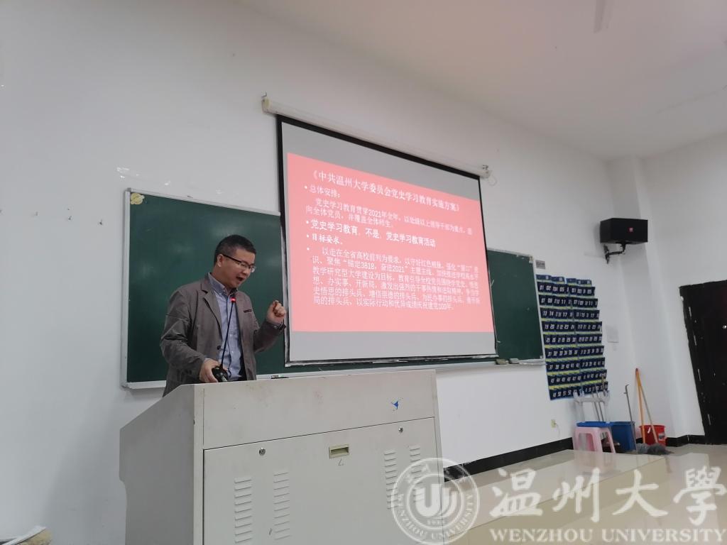 李方强书记首先传达了《中共MG冰球突破官网网站委员会党史学习教育实施方案》,重点传达了学校党史学习教育的总体要求和主要任务。其后,就学院党委党史学习教育具体工作做了部署。最后,李方强书记带领大家一起学习了“习近平总书记在中央党史学习教育动员大会上的讲话精神”、“省委书记袁家军同志在浙江省党史学习教育动员部署会上的讲话精神”、“温州市委书记陈伟俊同志在温州市党史学习教育动员部署会上的讲话精神”。