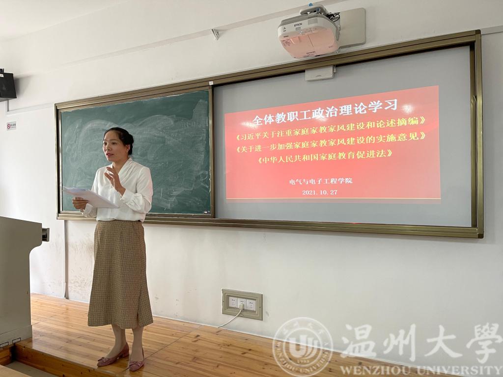 会议伊始,学院党委副书记曾蓓蕾带领全体教师学习了文件《习近平关于注重家庭家教家风建设和论述摘编》《关于进一步加强家庭家教家风建设的实施意见》《中华人民共和国家庭教育促进法》,提出家庭是社会的基本细胞,家庭建设是社会进步和国家发展的重要基础,家风建设是完善国家治理的重要依托。接着学院党委书记李方强为全体教工补充学习了黄大年事迹和浙江省委、温州市委相关会议精神。