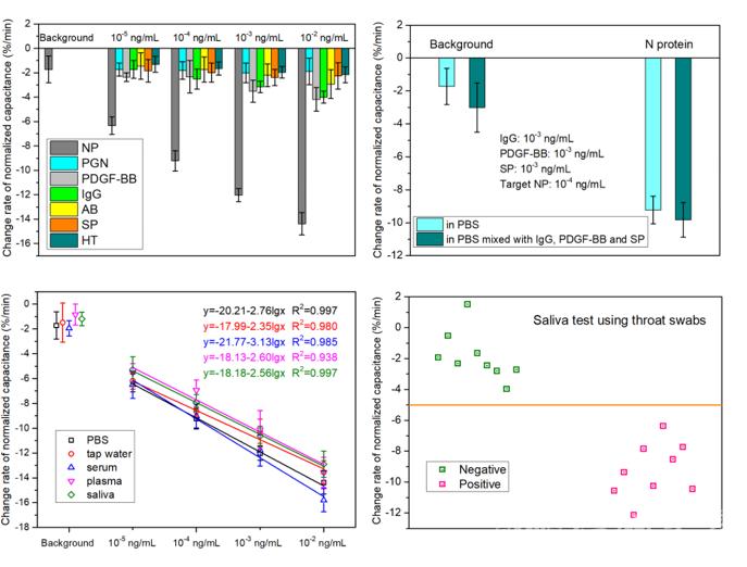 我校MG冰球突破官网网站张鉴教授课题组基于微流控富集和核酸适配体特异性识别机制,以病毒的核衣壳蛋白(N蛋白)为抗原,利用微加工传感器的pF级界面电容感应原理,实现了一种低成本、非标记、非测序的痕量新冠病毒标志物检测芯片及检测策略。N蛋白作为SARS-CoV-2的一种重要结构蛋白,在病毒RNA的组装和释放中起着关键作用,是一种理想的检测靶标。通常的抗原检测方法对痕量蛋白依赖额外的预富集装置及步骤,不易实现实时检测。课题组利用交流介电泳力驱动,在15秒内完成超痕量N蛋白的富集,同时巧妙利用界面电容变化率,在同一过程中完成传感信号读出。该传感器的检出限低至10-6 ng/mL,较之大部分已报道结果低4个数量级,线性范围为(10−5 ~ 10−2 )ng/mL,检测时间为15秒钟。课题组利用该传感器对血清、血浆、唾液、环境水等多种基质中的N蛋白进行了成功检测。