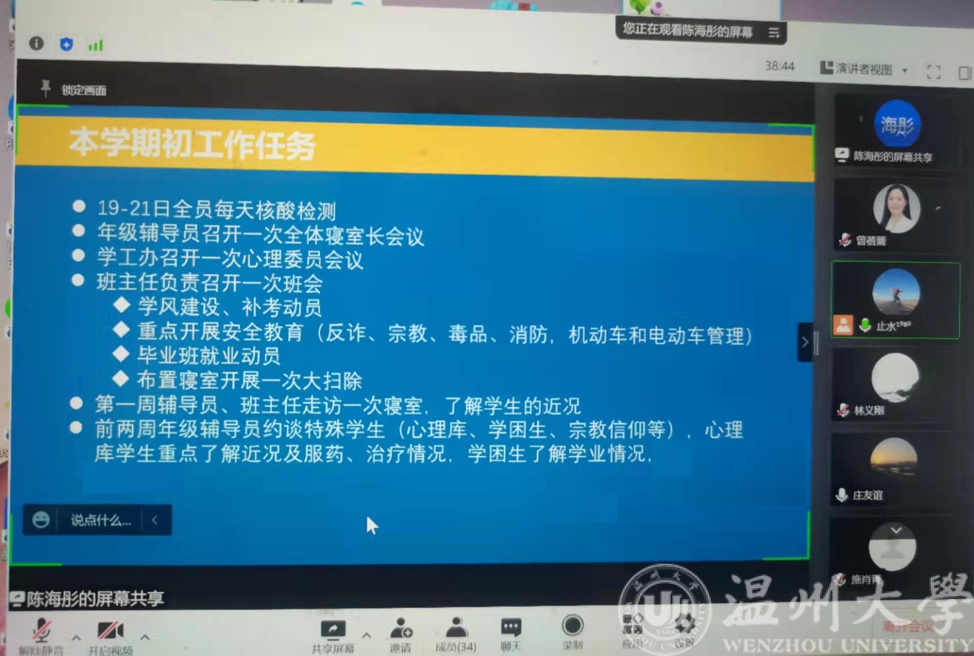 2月21日下午,MG冰球官网召开线上2021-2022学年度第二学期第一次全体班主任会议,会上学院党委副书记曾蓓蕾传达了学校疫情防控工作会议的主题精神,就第一周线上教学及生活区相对封闭管理等做了详细说明,重点强调了新学期组织引导学生开展宗教知识的学习活动。会上,学工办主任廖晓安老师还围绕《宗教工作知识手册》相关内容进行了安排说明。