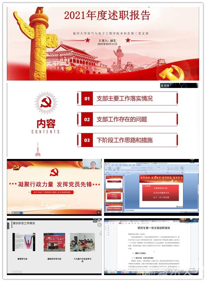 首先,由学院全体师生党支部书记作2021年度支部党建工作报告。MG冰球官网电气系、电子系、低压电器平台、行政教工、智能锁具研究院党支部,本科生第一、二党支部,研究生第一、二党支部,共九个党支部书记依次作述职报告,汇报了2021年支部党员发展、理论学习和活动开展等情况,深入剖析支部工作中存在的问题,以及2022年支部工作改进要点和方案。