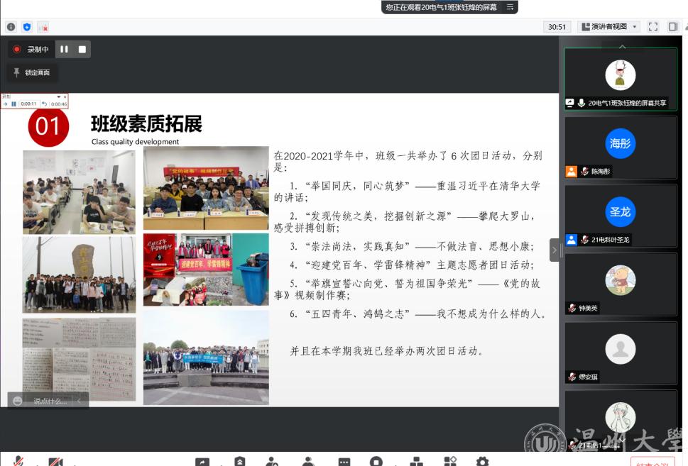 为进一步加强校风学风建设,树立优良学风,加大优秀班级的示范作用,MG冰球官网于2022年3月28日晚在线上举办“优良学风班”立项申请评选活动。学院本科生评选委员会委员以及申请立项的8个班级出席了本次活动。