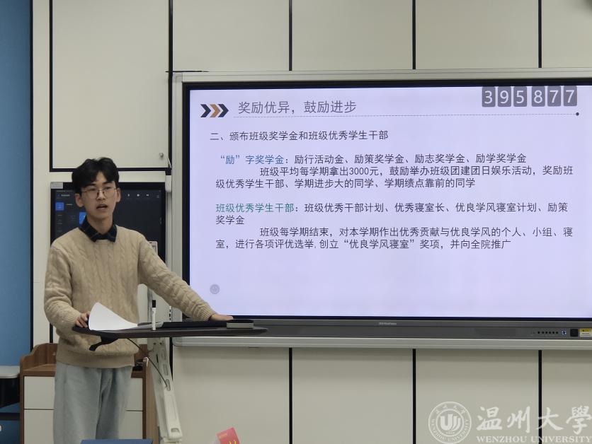 随后,19电科2班班长冯豪杰同学进行了优秀班级学生干部代表经验分享。他从“班级荣誉”、“班级政策”、“作为班长”和“19电科2与我”四个模块进行学生工作的经验分享。