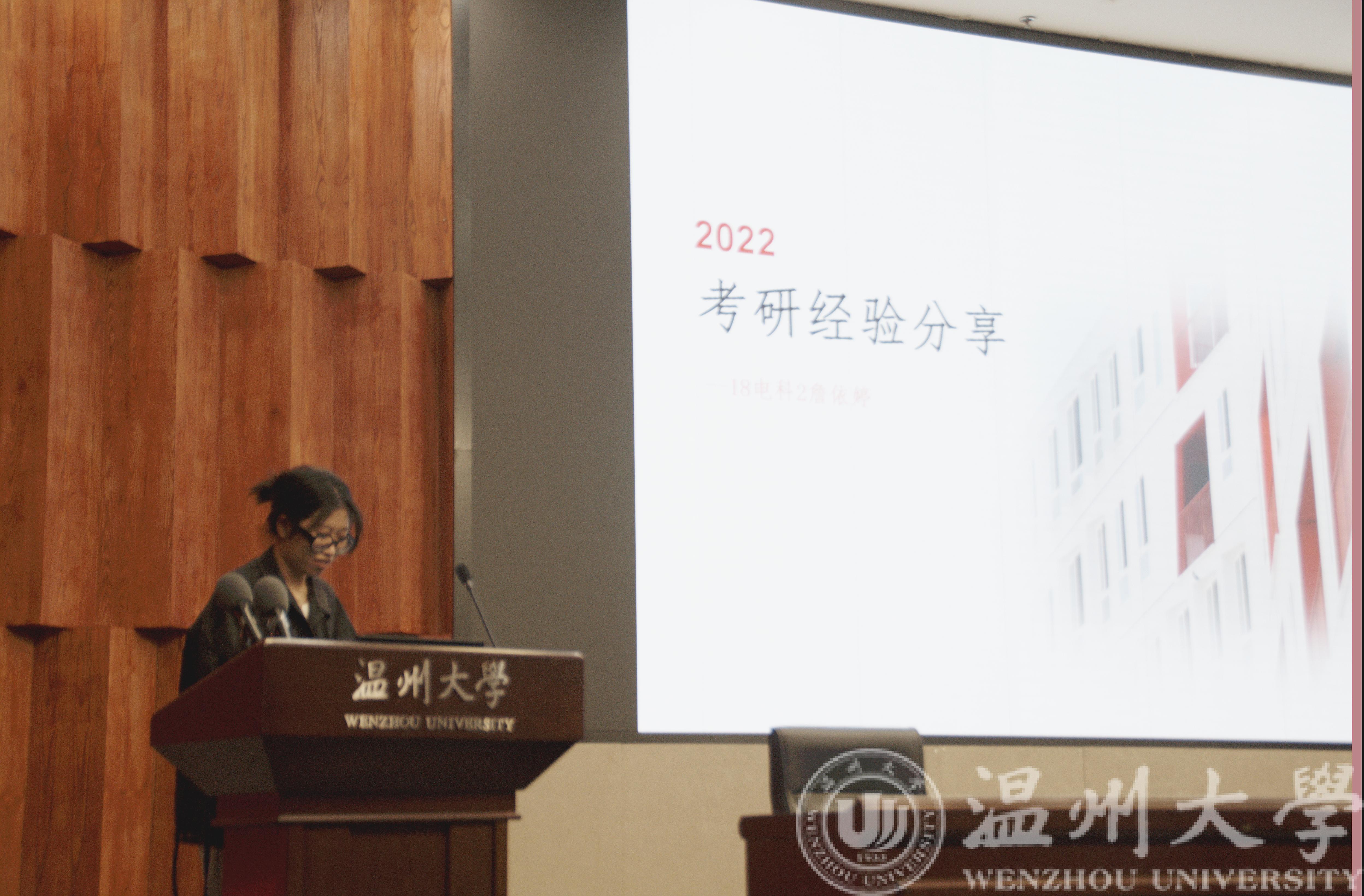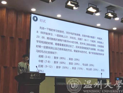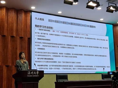 随后,7位毕业班同学依次上台汇报,在高校及专业选择、备考资料推荐、时间规划和管理、线上复试经验等方面分享了切身体会,鼓励学弟学妹们要瞄准考研目标,坚定自己的信念。多位学长学姐都提到了在复习时间的安排上,可以较早开始准备专业课的学习,其中吴鑫涛同学强调学习效率是第一位,要注重有质量的学习,找到让自己效率高的方法;倪世杰同学指出选择和努力一样重要,要做好正确的选择才能少走弯路;谢歆哲同学提出要戒骄戒躁,坚定自己的选择,不盲从各种考研博主和公众号,按着自己的步伐稳步向前。与此同时,学长学姐们也鼓励大家勇于报考985、211等实力更强的学校,要对温大的招牌有信心。学长学姐们都不约而同提到了竞赛的重要性,建议大一大二的同学多参加各类竞赛,不仅为自己积攒经验,也是在复试面试中尤为加分的一项。