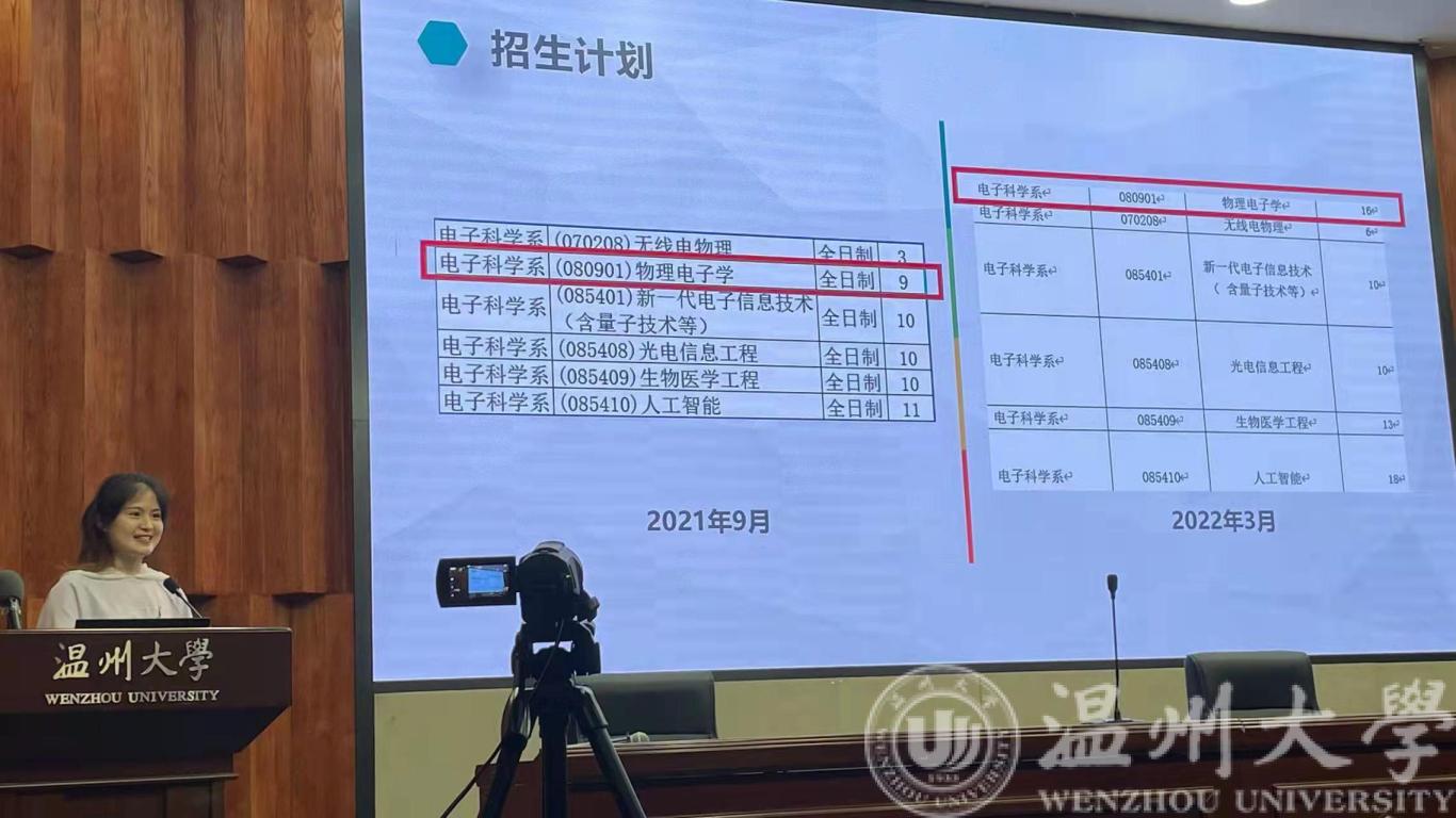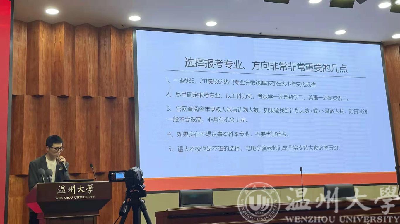 本次交流会由庄友谊老师主持,庄老师首先介绍了近年来电子系两个专业学生参加考研的整体情况,并从行业分析、生涯规划、学校政策等方面动员同学们积极准备考研,特别是考虑温大本校本专业的学术型硕士和专业型硕士。接着庄老师介绍了2022年度目前电子系本科生考研录取情况,指出今年的一大特点是名校录取人数和比例高,如浙大、同济、厦大、西电等。