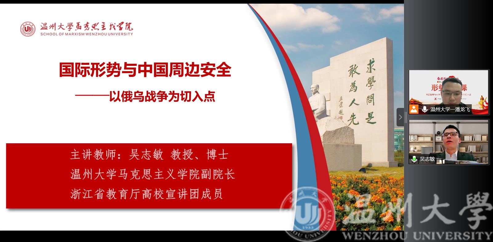 吴志敏教授讲座的主题是《国际形势与中国周边安全——以俄乌战争为切入点》,此次讲座主要从深刻认识百年未有之大变局、中国周边安全形势分析、大国博弈下的俄乌冲突及启示、“五位一体”外交战略新布局四个方面进行讲解。作为当代大学生,不久也将步社会,成为建设祖国的一份子,因此,在学习、工作、生活中,要秉持积极向上的态度,学好专业知识的同时,关注关心国家大事,不断提升自我能力,树立科研报国之志,为党的事业做贡献。