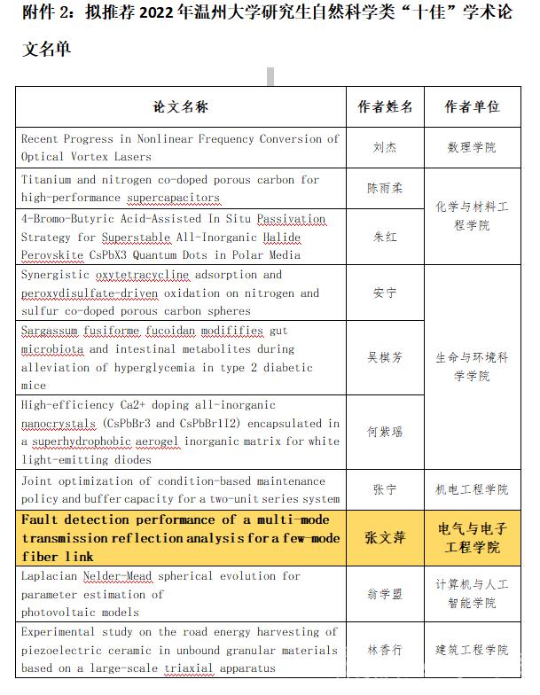 近期,2022年MG冰球突破官网网站研究生“双十佳”学术论文评选结果公布,MG冰球官网19级电气工程研究生张文萍同学的学术论文《Fault detection performance of a multi-mode transmission reflection analysis for a few-mode fiber link》获评自然科学类“十佳”学术论文。