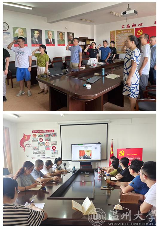 在支部书记曾蓓蕾的带领下,全体支部党员学习了《忠实践行“八八战略”坚决做到“两个维护”在高质量发展中奋力推进中国特色社会主义共同富裕先行和省域现代化先行——在中国共产党浙江省第十五次代表大会上的报告》、学习观看了《“国史讲堂”系列理论视频之“党史微课”系列》——中国共产党为什么能建立新中国、中国共产党为何能让旧中国面貌焕然一新两堂微课,重温历史,坚定入党初心,进一步加强了与会党员的党性修养。以实际行动迎接党的二十大胜利召开,为实现第二个百年奋斗目标、实现中华民族伟大复兴的中国梦作出新的更大贡献。在主题党日活动的最后,举行新党员入党宣誓和重温入党誓词仪式。 在领誓人的带领下,全体党员面向党旗,庄严宣誓!