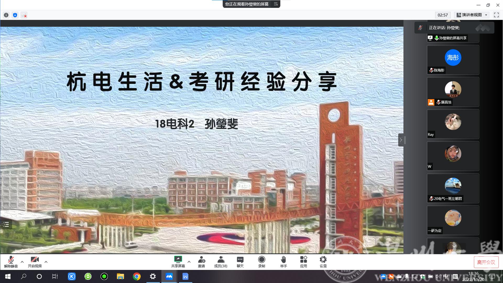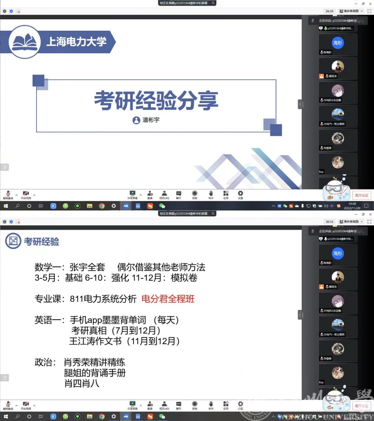 为进一步营造提高MG冰球官网学生考研热情,营造良好考研氛围,同时增强校友与母校交流合作,发挥校友榜样力量。学院于11月20日晚召开组织召开线上18级优秀校友考研经验分享会。本次分享会邀请到2022届优秀毕业生孙瑩斐(目前就读于杭州电子科技大学,电子科学与技术专业)、潘彬宇(目前就读于上海电力大学,电气工程专业)为学弟学妹们们分享考研经验和研究生生活。出席本次会议的有院负责校友工作的辅导员屠昌浩老师、负责考研工作的辅导员陈海彤老师,即将参加2023年考研的学生及其他年级有意向考研同学。