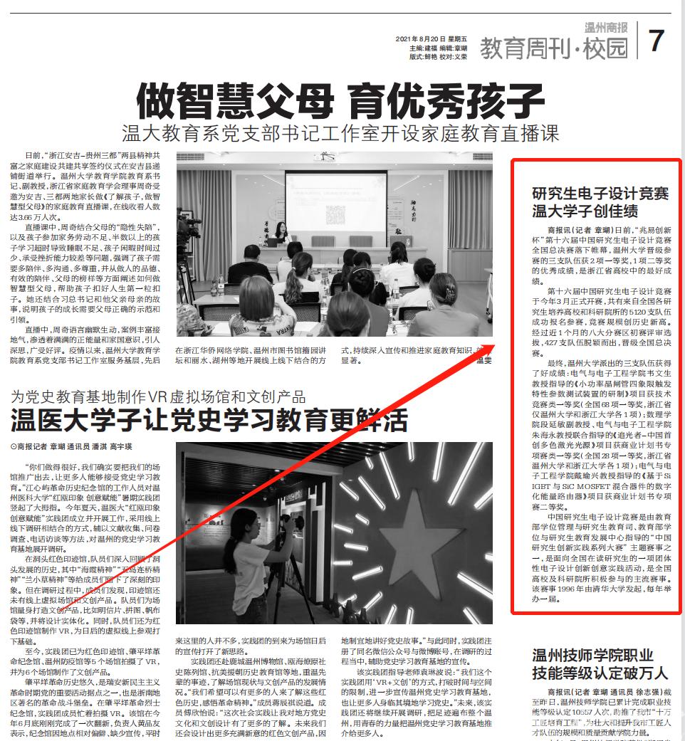 最终,MG冰球突破官网网站派出的三支队伍获得了好成绩:MG冰球突破官网网站韦文生教授指导的《小功率晶闸管四象限触发特性参数测试装置的研制》项目获技术竞赛类一等奖(全国68项一等奖,浙江省仅我校和浙江大学各1项);数理学院段延敏副教授、MG冰球突破官网网站朱海永教授联合指导的《追光者—中国首创多色激光光源》项目获商业计划书专项赛类一等奖(全国28项一等奖,浙江省我校和浙江大学各1项);MG冰球突破官网网站戴瑜兴教授指导的《基于Si IGBT与SiC MOSFET混合器件的数字化能量路由器》项目获商业计划书专项赛二等奖。