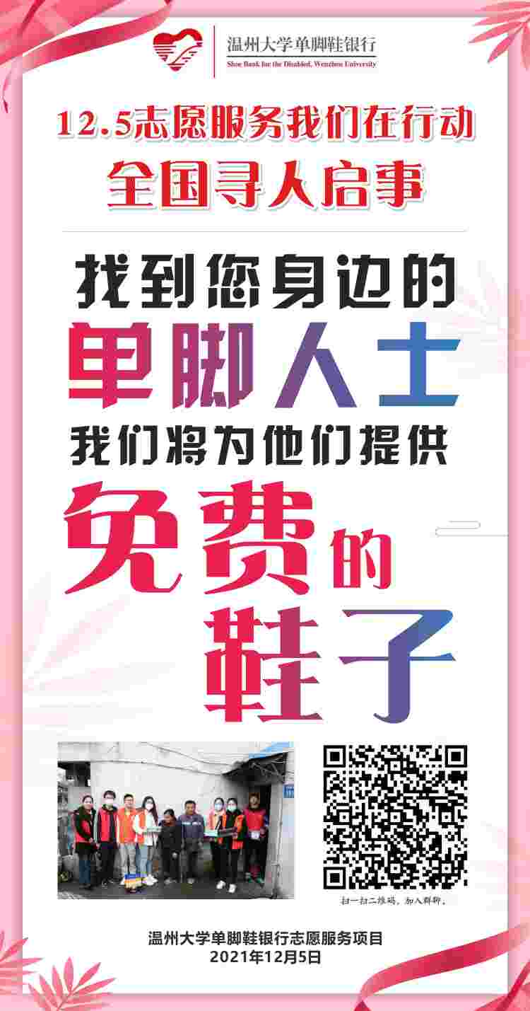 12月5日,一家银行的寻人启事吸引了来往群众的驻足。这是一家什么样的银行?他们又是在寻找谁?为什么引起了群众的关注。记者走近去一探究竟,发现原来这是MG冰球突破官网网站单脚鞋银行志愿服务项目团队,在寻找单脚残疾人士。