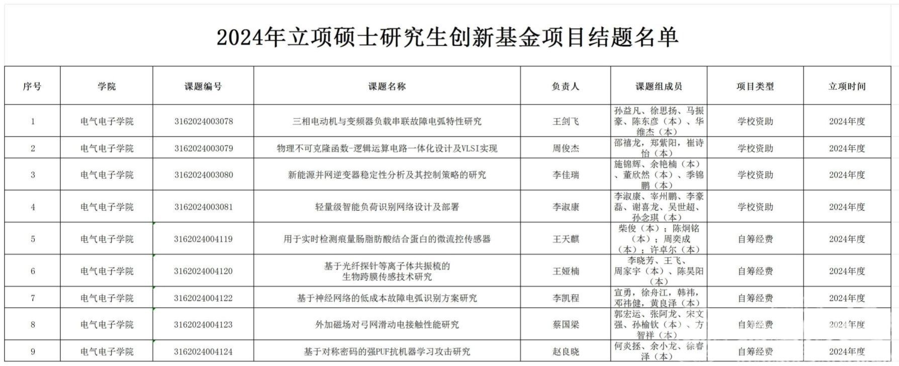 根据《MG冰球突破官网网站硕士研究生创新基金管理办法(2020年修订)》要求,经项目负责人申报、学院研究生工作委员会评审,拟同意《三相电动机与变频器负载串联故障电弧特性研究》等九个项目结题。现将拟结题名单公示如下,公示期从即日起至3月2日,如果有问题,请联系林老师86689117。